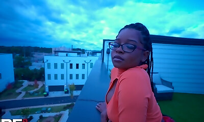 Tiny 4 eyed teen Arial Rose gets her pussy opened up from behind rough