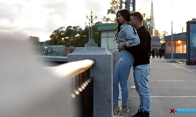 Big-chested girl showing off her round booty to seduce boyfriend for a risky sex in a public park