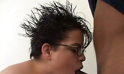 Nerdy looking darling is ready to open her facehole and suck that cock