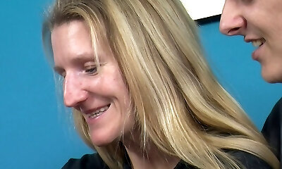 A tiny blonde teenie lesbian with pierced tongue gives a proper licking to her mature girlfriend with glasses