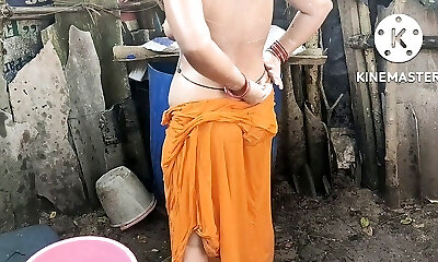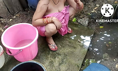 Indian mansion wife bathing outside
