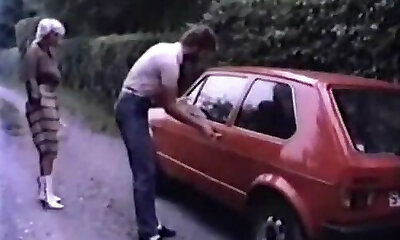 Beautiful classic busty blondie in the car gives head to her stud